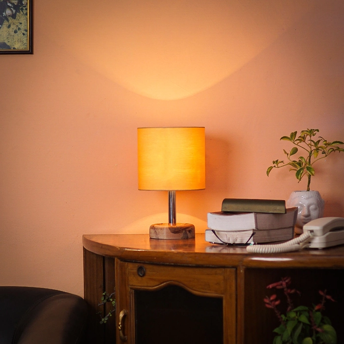 Edra Table Lamp With Cylindrical Gold Cotton Shade (11.5 inches, Wood)
